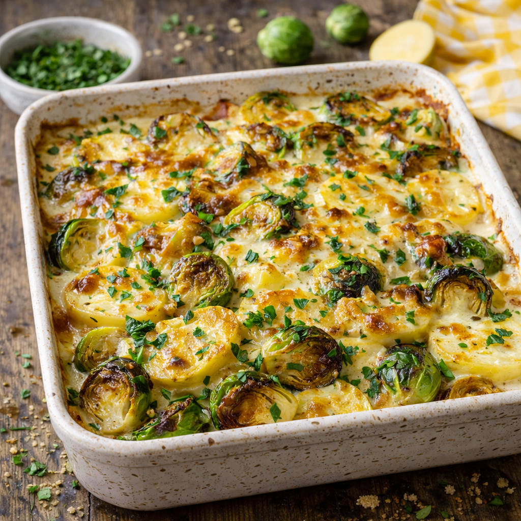 Creamy Sprout & Potato Gratin